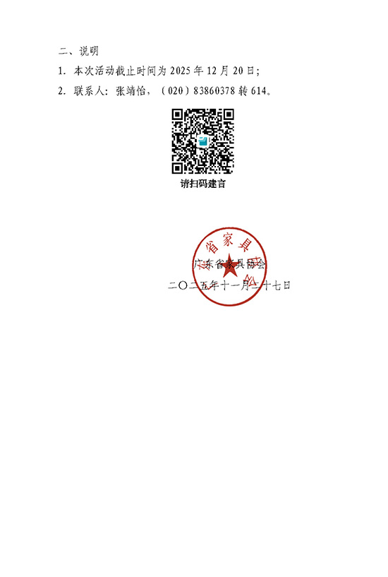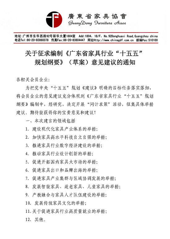 各相关会员企业: 为把党中央“十五五”规划《建议》明确的目标任务落实落细,将会员企业的意见建议充分体现到《广东省家具行业“十五五”规划纲要》编制中,经研究,决定开展“问计求策”活动,征集具体举措建议。期待能获得你的宝贵意见和建议! 一、本次建言的领域包括 1. 建设现代化家具产业体系的举措; 2. 加快家具高水平科技自立自强的举措; 3. 推进家具行业数字经济建设的举措; 4. 推动家具行业设计创新的举措; 5. 促进开拓国内家具大市场的举措; 6. 促进家具出口和品牌出海的举措; 7. 促进家具产业集群与区域协调发展的举措; 8. 发展智能家具、适老家具、儿童家具的举措; 9. 产教融合与家具人才队伍建设的举措; 10. 发展传统家具文化的举措; 11.关于促进家具行业高质量就业的举措; 12. 其他。 二、说明 1. 本次活动截止时间为2025年12月20日; 2. 联系人:张靖怡,(020)83860378转614。