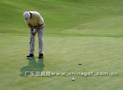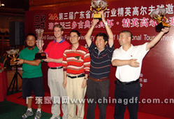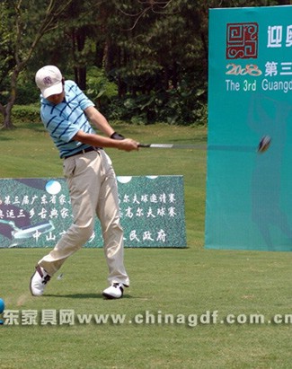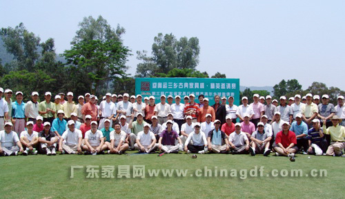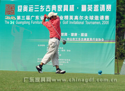 随着中国第一代职业高尔夫国家代表队肖成汉、林燕媚、林少茹、黄丽瑜和全国青少年高 尔夫球业余冠军周晓旋等5位特邀开球礼嘉宾的挥杆,中山温泉高尔夫球会杰克·尼克劳斯球场 的18个TEE台同时开球,拉开了第三届广东省家具行业精英高尔夫球赛的帷幕。