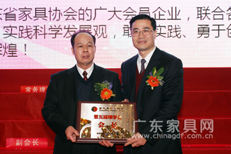 携手合作,共创辉煌!凤凰于飞,同心同行!1月13日,广州长隆国际会议中心张灯结彩,热闹非凡,广东省家具协会第五届理事会就职暨成立二十周年庆典在这里隆重举行。十届全国人大常委、中国轻工业联合会名誉会长陈士能,原广东省副省长匡吉,省经信委副巡视员孙鮀生,省外经贸厅副厅长朱泽南,省家协名誉会长、省二轻集团董事长舒海波,省民间组织管理局局长方向文,中国家具协会第一届理事长陈鼎新、名誉理事长贾清文、副理事长兼秘书长张冰冰,广东产品质量监督检验研究院院长胡南乾、中国对外贸易广州展览总公司副总经理马国勤等领导,以及来自省经信委、省外经贸厅、省发改委、省科技厅、省工商局、省质监局、省中小企业局、各特色专业镇、高等院校、行业协会、全省各地会员企业、新闻媒体的嘉宾和代表共一千多人共聚一堂,见证省家协第五届理事会就职,祝贺省家协成立二十周年,共谋广东家具行业这个优势传统产业的美好明天。 携手合作,共创辉煌 2010年12月23日,省家具协会第五届一次会员代表大会和理事会一次会议在广州召开,大会民主选举产生了第五届理事会。在就职典礼上,中国家具协会副理事长兼秘书长张冰冰代表中国家具协会和朱长岭理事长对广东省家具协会第五届理事会就职暨协会成立20周年表示祝贺。她说,改革开放三十年来,广东省家具行业一直是中国家具行业的排头兵、好榜样,总产销额占全国的三分之一,出口占全国的40%-45%。尤其是2006年,为我国家具出口首次超过意大利,成为世界家具出口的第一大国做出了重要贡献,也为中国家具行业以及轻工业发展做出了重要的贡献。广东省家具协会成立20年来,一直致力于推动中国环境友好型的常青产业,与中国家具协会保持了长期友好的合作关系,尤其是在举办中国广州国际家具博览会、创建中国名牌、创建中国驰名商标、制订出口规划以及行业标准、积极应对美国反倾销案的重大突破等方面做出了出色的贡献,是中国家具协会的优秀协会之一,为促进我国家具行业的发展做出了重要贡献。 广东省民间组织管理局方向文局长也亲临现场并对广东省家具协会取得的成绩表示祝贺。方向文局长指出,广东省家具协会成立以来,坚持依法办会,规范运作,认真履行宗旨,在促进广东家具行业发展、推动社会建设、构建和谐社会中做出了重大贡献。广东省家具协会是一个逐步与国际接轨的协会,是一个很有向心力,很有作为的协会。希望广东家具行业在全国是“老大”,广东省家具协会也能够争当全国同类协会的“老大”,广东省民间组织管理局将一如既往地关心支持广东省家具协会的工作,为协会争创“5A”等级,再创辉煌提供良好的服务,创造良好的条件。 新任会长王克在接过广东省民间组织管理局方向文局长授予的聘书和第四任会长王冶交予的签满第五届理事会成员名字的“力量之旗”后发表了就职讲话。王克表示,当选为第五届理事会会长,既是一种责任,更是一种挑战,对以王冶会长为首第四届理事会全体成员致以崇高的敬意。王克代表第五届理事会表态:在上级有关部门正确领导、指导下,团结带领全体会员积极开拓创新、锐意改革,继续践行“携手合作 共创辉煌”、“为行业服务、为会员服务、为政府服务”的宗旨,坚持科学发展观,根据《国家十二五规划纲要》精神,努力完成《广东省家具行业十二五发展规划》、《广东省家具行业五年出口规划》提出的各项任务和指标,新一届理事会愿与全省1000家会员企业一道,带动全省6000家家具企业携手合作、共创辉煌。