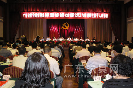 7月18日下午,广东省民政厅和广东省社会组织党工委在广东大厦三楼国际会议厅召开“广东省社会组织创先争优活动推进会暨社会组织党团工作先进单位和个人表彰会”。国家民政部、民间管理局和广东省领导,以及省民政厅和民间组织管理局等省属机关单位领导出席会议,国家民政部副部长姜力和副省长刘昆在会上讲话。受表彰的社会组织党团先进单位和个人代表、各社团单位代表约200多人参加了会议。省民政厅副厅长、党工委书记王长胜同志主持会议。