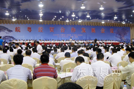7月30日,粤皖经贸合作发展会议在安徽合肥隆重举行。安徽省委书记、省人大常委会主任张宝顺,广东省委副书记、省长黄华华出席会议并讲话。安徽省委副书记、省长王三运主持会议,安徽省政协主席王明方,广东省委常委、常务副省长朱小丹等领导,各地级以上市政府和省有关部门主要负责同志以及粤皖两省的近4000名工商界人士出席会议。安徽省副省长黄海嵩介绍皖粤经贸合作情况。我会会长王克、秘书长张承志代表广东省家具协会应邀参加了会议。