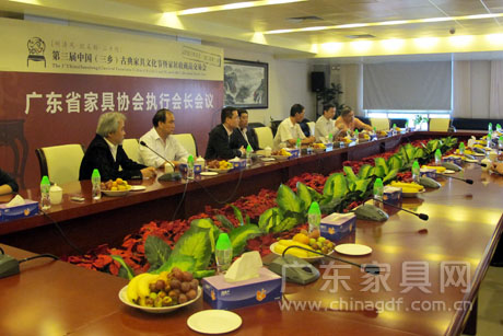 10月28日下午,借第三届中国(三乡)古典家具文化节暨家居收藏品交易会举行的机会,广东省家具协会在中山三乡镇政府三楼会议室召开执行会长会议,探讨古典家具产业的发展。中国家具协会理事长朱长岭亲临会议指导,为大家分析了当前我国家具行业发展的态势。省家具协会会长王克、副会长李礼以及部分执行会长出席会议并与中山三乡古典家具行业协会的部分副会长进行交流。 与会人员围绕古典家具的原材料识别、品类特色、诚信经营等方面进行讨论,认为古典家具体现着传统文化的传承和创新,随着人民对精神文化生活追求的提升,古典家具将迎来发展的春天。对于三乡古典家具产业的发展,应该融入更多的文化元素,在继续发展中式古典家具的同时,不能忽略欧美古典家具,尤其是家具彩绘工艺技术的发展。