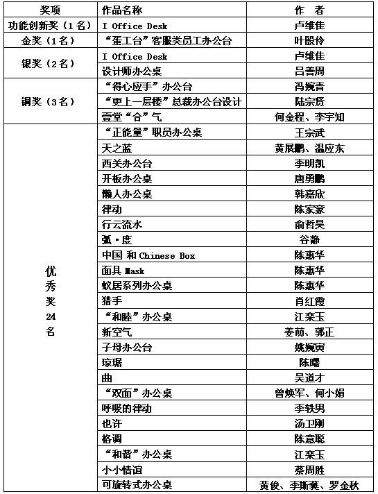 由广东省家具协会主办、中山市中泰龙办公用品有限公司协办的第二届“中泰龙杯”办公家具设计大赛终评专家评审会1月18日在中泰龙办公用品有限公司总部举行。本次大赛的主题是胶板办公台的设计,经过半年的作品征集,收到了来自省内外高校师生及设计师的积极投稿。 评委组本着公正公平的原则,最终评选出功能创新奖1名、金奖1名、银奖2名、优秀奖24名,所有获奖作品将在2013年3月18至21日举行的第五届广州家居设计展上展出,功能创新奖和金、银、铜奖的获奖选手还将由主办方邀请至2013年3月的广州家居设计展上现场领取荣誉证书和奖金。 评审结果: