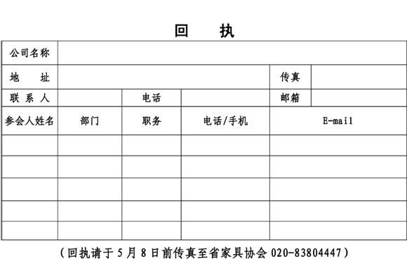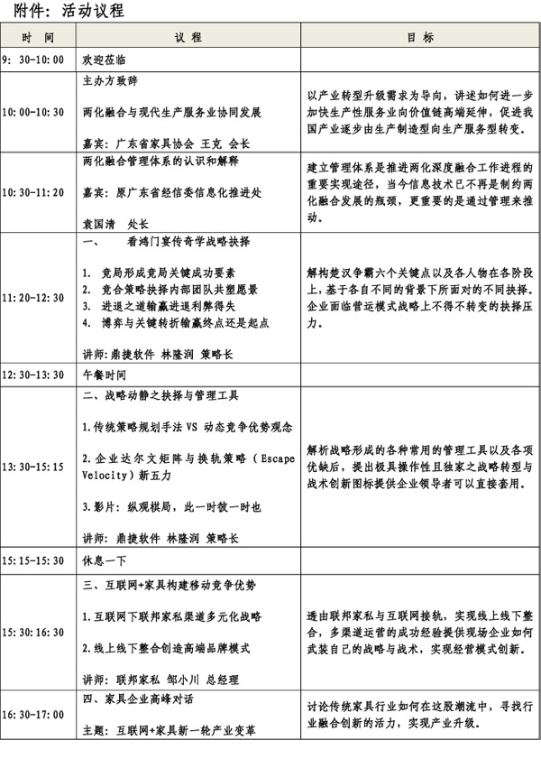 各会员单位: 为了应对“工业4.0”和“互联网+”不期而遇导致市场出现新的机遇和挑战,激发企业家们跨界发展战略,分析如何通过跨界的互联网思维及企业战略转型,顺势而上,向原有商业模式发起冲击,建立新一轮的市场优势与行业地位。经研究,我会定于5月13日与鼎捷公司联合举办“广东省家具行业‘互联网+’时代突破竞局困境高端论坛”。具体如下: 一、活动主题:“拨开转型迷雾,竞合智造升级”。 二、举办机构: 三、活动时间:5月13日,9∶30-17∶00。 四、活动地址:广州长隆酒店 1F 长隆厅(广州番禺区番禺大道长隆旅游度假景区)。 五、邀请对象:董事长、总经理、副总经理、总经办或相关部门负责人。 六、其它:1、请于5月8日前将回执填好回传省家具协会。2、联系人:王娟容,电话020-83860378转615, 传真:020-83804447。