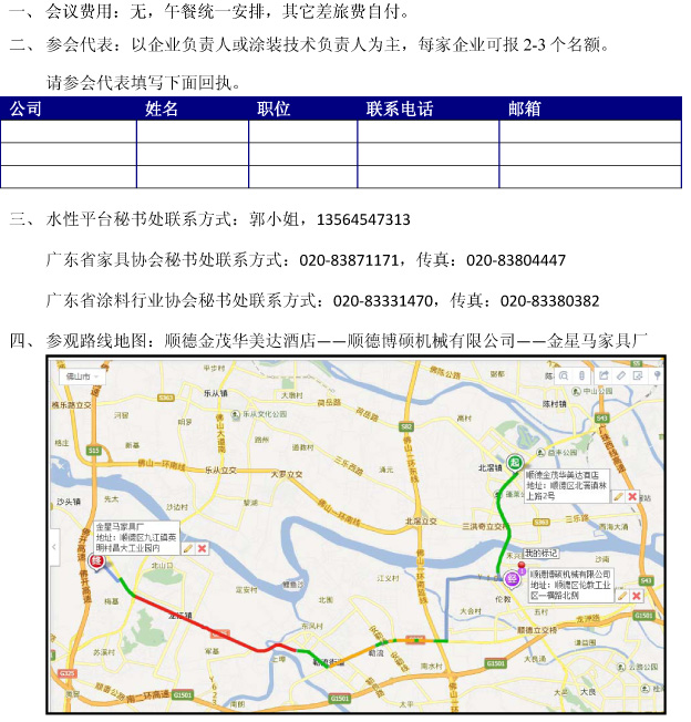 各会员单位: 为积极推进环保水性涂料在家具行业的应用,减少家具企业在涂装生产过程中VOCs的排放,加快家具行业的整体转型升级,中国化工学会涂料涂装专业委员会水性分会、广东省家具协会、广东省涂料行业协会定于2015年8月27日上午8点30分在顺德金茂华美达酒店组织召开“环保·水性——家具行业涂装应用推广会”。会议将围绕环保政策形势、家具市场趋势、水性涂装技术等方面展开,以家具行业上下游联动的形式,包括上游涂料供应商、设备供应商和下游家具企业,做技术推广和交流。 为了更好为企业提供宣传,会场提供展示平台统一搭架,每个展位面积2米X 1米,参与展示的企业需交展览费用4000元/个,收款单位:广东省家具协会,开户行:广州银行东华西支行,银行账号:304-270-8000240-06,开具发票,欢迎企业积极订购。 请有意向参会(或参展企业)于8月21日前将会议回执报省家具协会秘书处。联系人:陈凌:83872913,王娟容:83860378转615,刘文龙:83860378转607。传真:83804447。 会议回执、议程及展位效果图详见附件1、附件2。 广东省家具协会 附件1:议程、回执