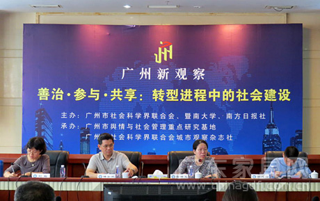 为探讨转型期社会治理,为党委政府治理社会提供参考意见和建议,走向善治社会。10月23日,以“善治·参与·共享:转型进程中的社会建设”为主题的第四期广州新观察学术圆桌会议在暨南大学举行。 会议由广州市社科联、暨南大学、南方日报社共同举办。围绕转型时期的社会治理展开,着重探讨政府转型与社会治理创新、社会组织与社会治理创新、社会多元治理主体间协调等问题。广州市社科联党组书记、主席曾伟玉,副主席郭德焱,暨南大学副校长林如鹏等领导出席并讲话。