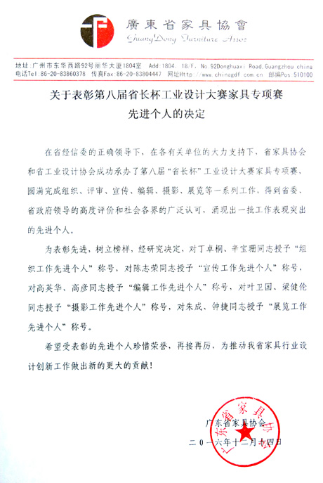 省家具协会王克会长在总结中表示,省家具协会把“省长杯”工业设计大赛作为引领家具产业设计创新的重要工作,把推动行业设计创新作为长期任务。在省经信委的正确领导下,省家具协会和省工业设计协会成功承办了第八届“省长杯”工业设计大赛家具专项赛。在家具专项赛组委会精心策划、周密安排下,得到了广东广厦、顺联家具城、大容广告、艺伦摄影、一线视界等单位的鼎力合作,有条不紊地圆满完成了各项承办工作,得到省委、省政府领导的高度评价和社会各界的广泛认可。在组织、评审、宣传、编辑、摄影、展览等一系列工作,涌现出一批工作表现突出的先进个人,值得肯定和表彰。 通过赛事将更好地推动行业设计创新和发挥全省家具企业、设计机构及相关设计类院校在工业设计创新体系中的主体作用,对鼓励企业加大工业设计创新投入,推动工业设计成果产业化起到积极引导作用。