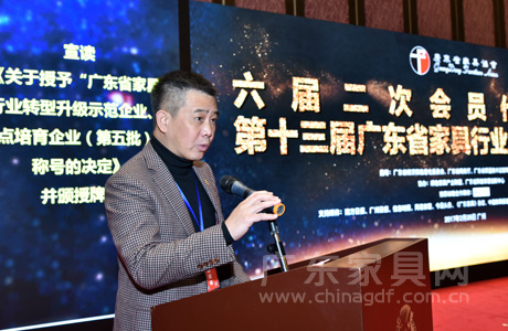 会上,广东省家具协会会长王克在《2017年广东家具行业形势与对策报告》中提出2017年全省家具行业发展主题:“实施‘三品’战略:全面掀起绿色家具发展浪潮”。2017年,将坚持以“创新驱动•技术改造•环境治理•优化升级”为行业发展指导思想,着力实施“增品种、提品质、创品牌”的“三品”战略,以大力发展绿色家具产业联盟为主要抓手,全面掀起“绿色家具、创新发展、提升品质、引导消费”的绿色家具浪潮。把绿色家具、定制家具、智能家居、新中式家具、多功能家具作为发展重点,加快骨干企业工业化、信息化与现代生产服务业深度融合。鼓励骨干企业兼并重组、上市融资,探索产业联盟、技术联盟、品牌联盟新路子,从追求规模速度转向追求规模效益转变,保持全行业5%左右的整体增长速度,形成广东省家具行业的竞争新优势,促进我省家具行业健康、稳步发展。 根据2017年我省家具行业面临国内国际经济形势,结合行业发展实际和协会工作,王克会长在报告中提出十点对策建议:1、扩大内需,积极加大新兴市场的开拓力度;2、稳住出口,积极巩固行业发展的长效机制;3、环境治理,积极推进行业环保和清洁生产;4、三品战略,积极应对消费升级趋势;5、绿色联盟,积极掀起绿色家具发展浪潮;6、文化红利,积极传承和培育当代工匠精神;7、政策利好,资本上市让股权投资成为新宠;8、实业回归,积极参与供给侧结构性改革;9、消费升级,积极贯彻维护消费者合法权益;10、提高素质,增强社会组织服务能力建设。