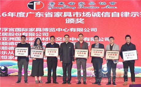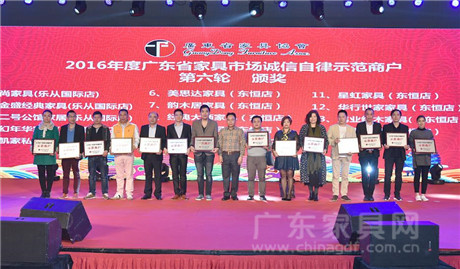 为推动我省家具市场诚信体系建设,广东省家具协会在晚会上对广东罗浮宫国际家具博览中心有限公司等7家单位授予“广东省家具市场诚信自律示范市场”称号;对广东联邦家私集团有限公司等30家单位授予“2016年度广东省家具市场诚信自律示范企业”称号;对华辉家居(罗浮宫店)等84家单位授予“2016年度广东省家具市场诚信自律示范商户”称号。