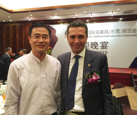 3月15日,在第37届国际名家具(东莞)展览会欢迎活动中,广东省家具协会会长王克与巴西国会议员、巴西国会中巴友好委员会主席福斯托·皮纳托(Mr.Faustian.Pinato)先生交流。