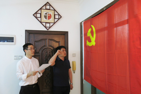 4月19日,广东省家具协会党支部举行新党员入党宣誓仪式。协会党支部书记、会长王克同志主持宣誓仪式。 宣誓仪式正式开始,在奏唱雄壮的《中华人民共和国国歌》后,新党员曹添财在党支部书记王克同志的带领下,持立正姿势,举右手握拳,面向党旗,庄严宣誓。