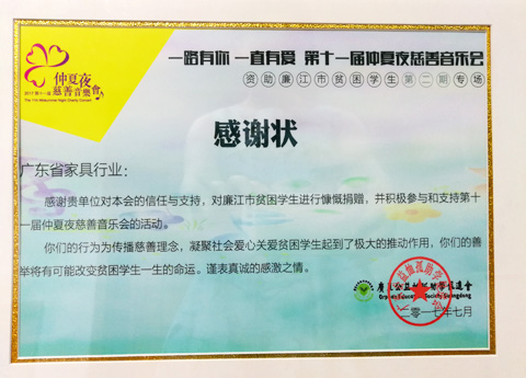 7月30日,第十一届仲夏夜慈善音乐会在广州星海音乐厅拉开帷幕。本场音乐会是资助廉江市贫困学生第二期专场,由广东公益恤孤助学促进会主办。会上,举行了第二期访贫助学廉江行项目的捐资助学捐赠仪式。广东省家具协会会长助理、共青团广东省家具行业工作委员会书记张靖怡出席活动,并代表广东省家具行业捐赠9万元。