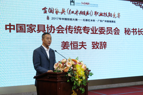 中国家具协会传统专业委员会秘书长姜恒夫在致辞中对番禺赛区的顺利开赛表示热烈的祝贺。他指出,本次比赛是中国家具行业内首次举行国家级竞赛,得到了行业内企业和从业人员的热烈响应和大力支持,番禺赛区各项赛事工作完善,为参赛选手提供了一个优异的比赛条件。 参赛选手张德双、广东省非物质文化遗产传承人何世良分别代表参赛者、评审委员会宣誓。