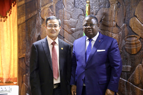 29日下午,胡长春大使、刘绍喜团长带领代表团一行,前往加蓬总理府拜会加蓬总理恩贡戴,王克会长应邀出席。在会谈中,刘绍喜团长向恩贡戴总理介绍宜华集团拟建立中加国际林业产业园区项目计划。恩贡戴总理对此表示极大兴趣,并对宜华集团能在加蓬有如此大的投资表达谢意。他还强调,邦戈总统以及其本人都会积极支持此项目,加蓬各界也会为此项目顺利开展提供便利条件。