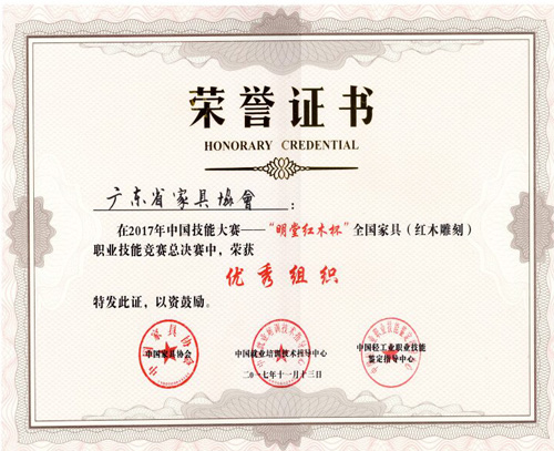 广东家协荣获全国家具(红木雕刻)技能竞赛“优秀组织”等3项荣誉 2017-11-21 来源:广东家具网