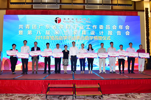 从2015年起,广东省家具协会和广东家具团工委每年定期举办捐资助学活动,通过广东公益抚孤助学促进会的服务平台,采取实名制、点对点地捐款资助广东农村孤贫学生的生活和学习。为了进一步培养行业青年的社会责任感,广东省家具协会、共青团广东家具行业工作委员会共同发出捐资助学的倡议,用真诚和善举帮助孤贫、失学儿童。在捐资助学捐赠仪式上,广东省家具协会、何广经、佛山顺联集团、中山华盛家具、广东迪欧家具、中山中泰龙、中山四海家具、佛山欧慕坊家居、佛山南海狮山博爱慈善会、丽江椅业、东莞兴华家具、广东广厦等单位、个人踊跃为孤贫失学儿童捐善款,献爱心。