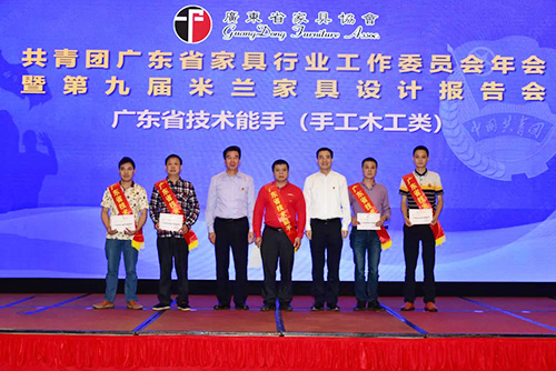 2018年中国技能大赛全国家具制作职业技能竞赛广东分赛区的5名优胜选手徐力频、黄铁山、李皋生、彭进义、熊志峰被省人力资源和社会保障厅授予“广东省技术能手”称号。会上,进行了颁发证书仪式,并号召行业团员青年学习“广东省技术能手”的工匠精神,用奋斗的青春建功新时代。