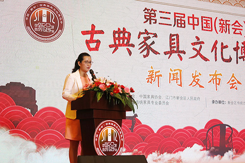 发布会上,胡悦玲介绍了新会古典家具文化传统、产业发展态势和文化博览会的筹备情况。她指出,新会是“广作”古典家具的发源地之一,目前,新会古典家具相关企业4000多家,建成十里古典家具长廊,行业年产值超100亿元。希望借助媒体力量,提升博览会知名度和影响力,推动古典家具文化的传承与发展。 会上,还举行以“就湾区建设机遇,论古典家具产业未来发展”为题的中国古典家具行业论坛,邀请行业专家为新会古典家具产业的传承创新和跨越发展建言献策。