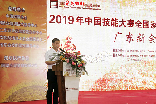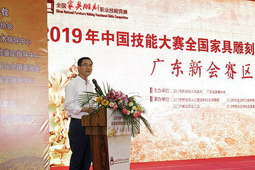 广东省家具协会会长王克在致辞中表示,在我国著名的侨乡江门市,在著名的广作家具发源地之一新会,共同见证第二届全国家具雕刻职业技能竞赛新会分赛区选拔赛闭幕式,这是我省三个分赛区最后一场赛事。习总书记强调,发展是第一要务,人才是第一资源,创新是第一动力。广东省家具协会作为5A级的社会组织,一直致力推动行业的“创新驱动、技术改造、环境治理、优化升级”工作,十分重视和支持全国职业技能竞赛,先后圆满完成两届广东分赛区选拔赛,让一大批普通技术工人得到社会、行业的认可,获得高级工或技师职业资格,成为行业技术能手、省技术能手。在中国家具协会、广东省职业技能鉴定指导中心等单位的热情指导下,在新会政府部门的大力支持下,与新会区传统古典家具行业协会通力合作,圆满完成各项竞赛任务,让众多普通的一线员工脱颖而出,在比赛中展示他们的能力,展示传统家具技艺的魅力,让他们得到社会的认可,进一步营造重视、关爱、培养人才的优良环境,遴选更多的工匠之星、家具行业技术能手,为培养新时代发展需要的高素质劳动者和技能型人才,为我省家具行业高质量发展做出新的更大贡献。希望,获奖选手回到各自的工作岗位,能够戒骄戒燥、坚守初心、爱岗敬业、精益求精,为红木家具产业传承创新发挥积极作用。