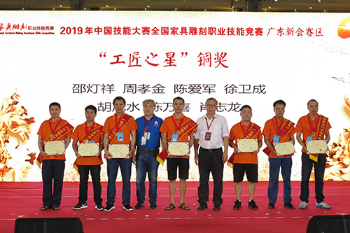 闭幕式上,还举行了“新会传统家具十大雕刻工艺师”颁奖仪式。 随着新会赛区的闭幕,第二届全国家具雕刻职业技能竞赛广东三个分赛区选拔赛圆满收官,获奖作品将于10月25日至29日在第十四届中国(乐从)红木家具艺术博览会上展出。同时,各赛区将按照名额要求,推荐获得职工组前10-12名的选手,参加计划于11月举行的2019年中国技能大赛全国家具雕刻职业技能竞赛广东赛区总决赛。