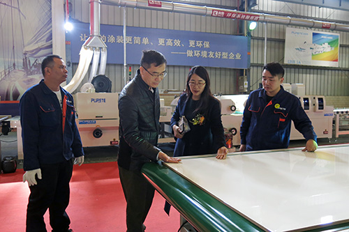 12月6日,广东省家具协会会长王克前往顺德普瑞特机械制造有限公司调研。在普瑞特总经理付秋霞的陪同下,王克会长参观了智能系统、滚涂系统、淋涂系统、膜压系统、喷漆系统、平贴系统演示区,了解智能涂装设备的性能和应用情况。