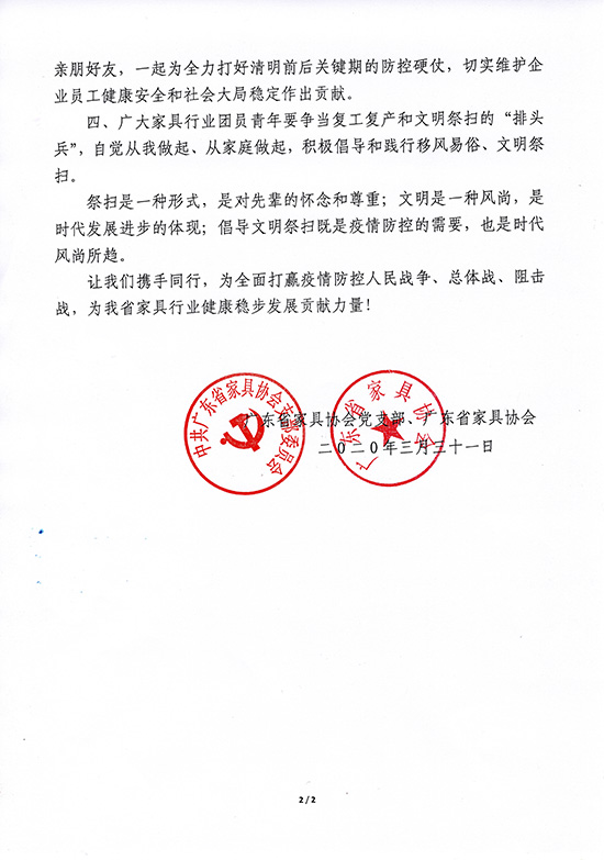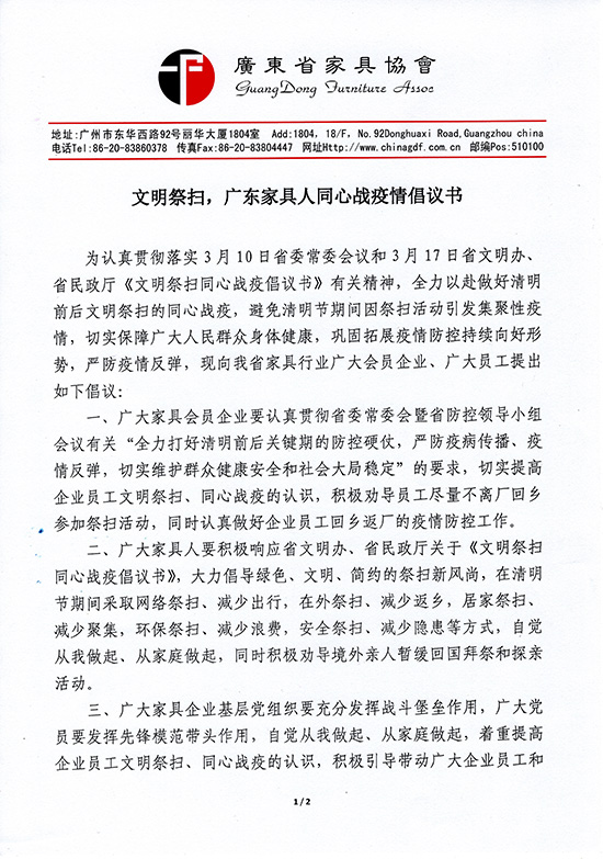 广东家协发布《文明祭扫,广东家具人同心战疫情倡议书》 2020-4-1 来源:广东家具网