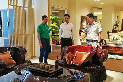 在陈建京董事长的陪同下,王克会长一行参观了华颂、檀颂、名鼎檀、金凯莎品牌的产品展厅,对华颂家居所取得的成绩,以及将精工榫卯技术融贯于古今中西各类家居作品的设计与制作中表示赞赏。鼓励华颂家居坚持设计创新,加强知识产权保护工作,并积极参加以“设计赋能产业”为主题的第十届“省长杯”工业设计大赛泛家居专项赛。