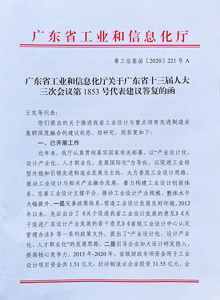 广东省工信厅书面答复王克代表有关工业设计的《建议》 2020-6-29 来源:广东家具网