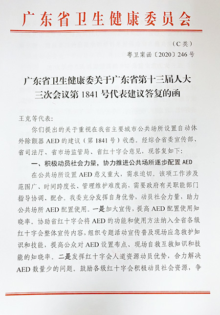 答复指出,在公共场所设置AED意义重大,需求迫切。该项工作涉及范围广、时间跨度长、管理维护难度高,需要政府有关职能部门指导协调、配合。 答复表示,将从四个方面推进:一、积极动员社会力量,协力推进公共场所逐步配置AED。今后我委将充分发挥自身优势,动员社会力量,助力公共场所AED配置使用。一是加大宣传,提高AED配置使用知晓率。协助省红十字会将AED的功能和使用方法纳入全省各级红十字会整体宣传内容,组织专题活动宣传普及现场应急救护知识和技能,提高公众对AED设置布点、现场自救互救知识和技能的知晓率。二是发挥红十字会人道资源动员优势,合力解决AED数量少的问题。鼓励各级红十字会积极动员社会资源,争取财政资金支持,发动社会爱心捐赠,努力增加辖区内公共场所AED配置的数量。三是继续做好AED使用操作培训,普及使用AED急救技能。配合设置单位做好主要操作人员培训,指导做 好AED的管理和维护工作。二、大力推广普及CPR急救技能和AED使用方法。三、创新培训方式,不断扩大应急救护培训覆盖面。四、协助推动法律法规配套建设,推行急救免责法,保障公 民行使急救的权利。 据悉,今年年初召开的广东省第十三届人大三次会议期间,省人大社会建设委委员、省社会组织党委委员、省家具协会会长王克围绕我省社会、经济、民生积极建言献策,提交了六份书面《建议》,受到省政府相关部门的肯定。其中,《关于重视在我省主要城市公共场所设置自动体外除颤器(AED)的建议》认为,为进一步加快推进健康广东建设,积极应对我省进入老年化社会,贯彻落实党的十九大关于坚持以人民为中心的发展思想,更好地保障和改善民生,积极构建共建共治共享社会治理格局,提升我省公共服务能力,提升人民群众的获得感、幸福感、安全感,针对主要城市公共场所、大型活动设置便携式自动体外除颤器严重不足,导致众多心脏骤停患者在“黄金四分钟”得不到及时救助的现状,重视在我省主要城市公共场所设置AED十分必要。 十条具体建议,一是研究出台相关指导意见,把我省主要城市在公众场所心肺复苏科普和设置AED,纳入院前急救机制。要为“黄金四分钟”急救生存链“建链、补链、强链”,加强硬件与软件的建设。二是重视AED政策研究和发展规划,按照我省主要城市公共场所重要性进行设置AED分类,一类区域列为优先重点发展,二类区域列为优先跟进,三类区域列为全面推进。三是重视解决AED“数量少”的问题。在主要城市集中力量分类建设、逐步推进,形成立体防控网。四是重视解决AED“敢用”的问题。扫清法律障碍,我省需要研究制定共场所设置和使用AED的相关条例。重点解决导致“黄金四分钟”急救生存链断裂的“三不”问题,即急救过程中“怕担责不敢救”、“无技术不会救”、“无设施不能救”,让见义勇为的急救不再尴尬,让现场救护的行为不担法律责任。五是重视解决AED“资金少”的问题。六是重视AED“查得到、看得见、找的着”问题。七是重视解决AED“认知少”的问题。八是重视解决使用AED“培训少”的问题。九是视逐步向家庭普及,AED由于轻巧便携、操作简单,第四个发展目标是向广大市民AED科普宣传,鼓励心脏病患者家庭和有老年家庭购置和有效应用AED,提高防范化解人民群众居家心脏骤停危机的普及率和主动性。十是重视发展AED产业,加快发展我省AED产业,打破进口产品高价格垄断,推进健康广东建设势在必行,更好地保障和改善民生,积极构建共建共治共享社会治理格局,提升我省公共服务能力,提升人民群众的获得感、幸福感、安全感。