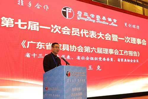 新当选的第七届理事会会长王克在讲话中表示,十分感谢大家投票选举我为新一届理事会专职会长,这是大家对我在省家协服务三十年工作能力和工作业绩的肯定,也感受到继续担任一届会长面临新的期望和新的要求。对此,有信心、有决心、有能力在大家的支持和共同努力下,不忘初心、牢记使命,团结一心、砥砺前行,带领协会完成好各项工作任务!第七届理事会将坚持党建引领,不断深入学习贯彻习近平新时代中国特色社会主义思想,唱响“社会组织永远跟党走”,为共建、共治、共享社会治理格局发挥社会组织应有的新作用。 王会长强调,我们要继续践行“为行业、会员、政府服务”的办会宗旨,在坚持办好传统品牌服务项目的同时,不断改进存在问题和不足,不断创新工作思路和工作方法,不断继续保持在同行的先进性,不断锻造政治站位高、服务能力强的5A级优秀协会。根据省委关于建议我省“十四五”时期经济社会发展指导方针和主要目标,以推动高质量发展为主题,以深化供给侧结构性改革为主线,以改革创新为根本动力,以满足人民日益增长的美好生活需要为根本目的,认真编制《广东省家具行业十四五发展规划》,积极引导行业企业走创新型、效益型、集约型、生态型的发展之路,为推动我省家具行业高质量发展,为我国从家具大国向强国迈进作出应有的贡献!