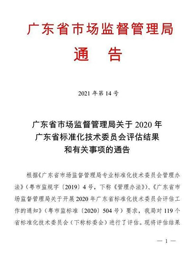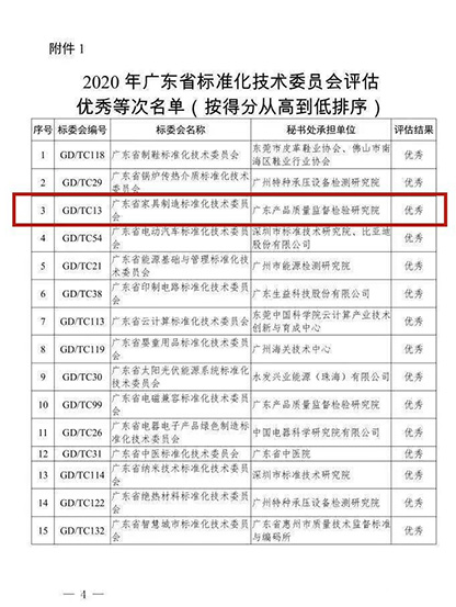 近日,广东省市场监督管理局通报了2020年广东省标准化技术委员会评估结果,广东省家具制造标准化技术委员会凭着规范的管理制度和突出的工作成绩连续四次获得“优秀”等级。