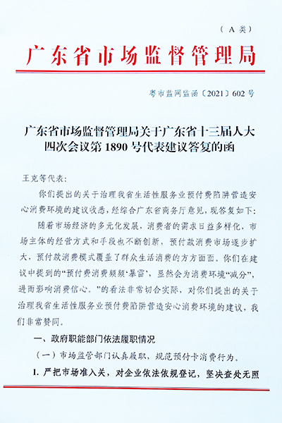 《答复函》指出,随着市场经济的多元化发展,消费者的需求日益多样化,市场主体的经营方式和手段也不断创新,预付款消费市场也逐步扩大,预付款消费模式覆盖了群众生活消费的方方面面。你们在提案中提到的“预付费消费频频‘暴雷’会为消费环境“减分”,进而影响消费信心。”的看法非常切合实际,对你们提出的关于治理我省生活性服务业预付费陷阱营造安心消费环境的建议,我们非常赞同。 《答复函》强调,下一步工作打算: 据悉,今年初召开的广东省第十三届人大四次会议期间,省人大社会建设委委员、省社会组织党委委员、省家具协会会长王克围绕我省社会、经济、民生积极建言献策,提交了六份书面《建议》,受到省政府相关部门的肯定。 其中,《关于治理我省生活性服务业预付费陷阱 营造安心消费环境的建议》指出,为进一步促进我省扩大内需、拉动消费,推动法治中国建设,满足人民日益增长的美好生活需要,形成以国内大循环为主体,国内国际双循环相互促进新格局,推进治理体系和治理能力现代化,统筹发展和安全,实现经济行稳致远、社会安定和谐,在全面建设社会主义现代化国家新征程中走在全国前列,治理健身房、教育机构、美容美发、洗车店、洗浴中心、养老院等生活性服务业预付费陷阱,营造安心消费环境一事势在必行。 《建议》提出了五点具体建议: