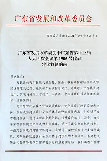 《答复函》表示,感谢您对我省政务诚信体系建设、优化营商环境的关心和支持!政务诚信建设是社会信用体系建设的重要内容,您分析了我省在建筑业、制造业领域欠薪问题,以及政府部门、国企、事业单位在项目建设中的违约失信现象,提出了建立约束惩戒机制、加强对合同履约的监管等建议,这对进一步做好我省政务诚信建设,充分发挥政府在社会信用体系建设中的表率作用,着力打造法治化营商环境等工作都有很好的启发和帮助,我们将在工作中认真学习和吸收。 《答复函》指出,近年来我省政务诚信体系建设主要做了以下工作:1、出台政务诚信建设方案,夯实政务诚信制度基础。2、强化政务诚信法治保障,探索构建政务诚信监督体系。3、推进招投标制度改革,营造公平竞争的市场环境。4、开展欠薪专项工作治理,保障民营企业中小企业及农民工权利。5、规范项目签约履约监管,保证市场主体经济利益。 《答复函》强调,下一步,我省将坚持以习近平新时代中国特色社会主义思想为指导,紧紧围绕党的十九大提出的“增强政府公信力和执行力,建设人民满意的服务型政府”的目标要求,大力推进政务诚信建设。实施政务诚信考核评价,开展政务诚信检测治理;加强行政合同履约跟踪管理,督促推进违约失信行为整改;完善招投标管理制度,加强对招投标活动监管;深化重点领域信息公开,加强政策解读与回应,督促解决重点工程、进入司法程序项目等历史遗留问题,推动政务诚信工作再上台阶。 据悉,今年初召开的广东省第十三届人大四次会议期间,省人大社会建设委委员、省社会组织党委委员、省家具协会会长王克围绕我省社会、经济、民生积极建言献策,提交了六份书面《建议》,受到省政府相关部门的肯定。 其中,《关于推进我省政府、国企、事业单位在项目中诚信建设的建议》指出,全面实施国务院公布的《优化营商环境条例》、《招标投标法实施条例》,加强我省政务诚信建设,提高政府等相关部门权威性、公信力、诚信度,促进治理体系和治理能力现代化,实现经济行稳致远、社会安定和谐,推进政府部门、国企、事业单位在货物、工程、服务等项目中的诚信建设十分必要。 王克代表在《建议》提出,八点具体建议: