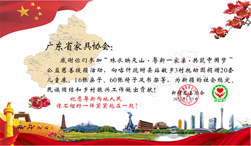 据悉,今年1月春节前夕,在省社会组织管理局指导下,省家具协会联合执行会长单位、中山市华盛家具制造有限公司参加“珠水映天山•粤新一家亲•共筑中国梦”公益慈善援疆活动中,直接向喀什疏附县站敏乡3村托幼园捐赠20套儿童床、16张桌子、60张椅子及书架等,为新疆的社会稳定、民族团结和乡村振兴工作做出新的贡献,为此,新疆慈善总会发来捐赠证书,以示感谢!
