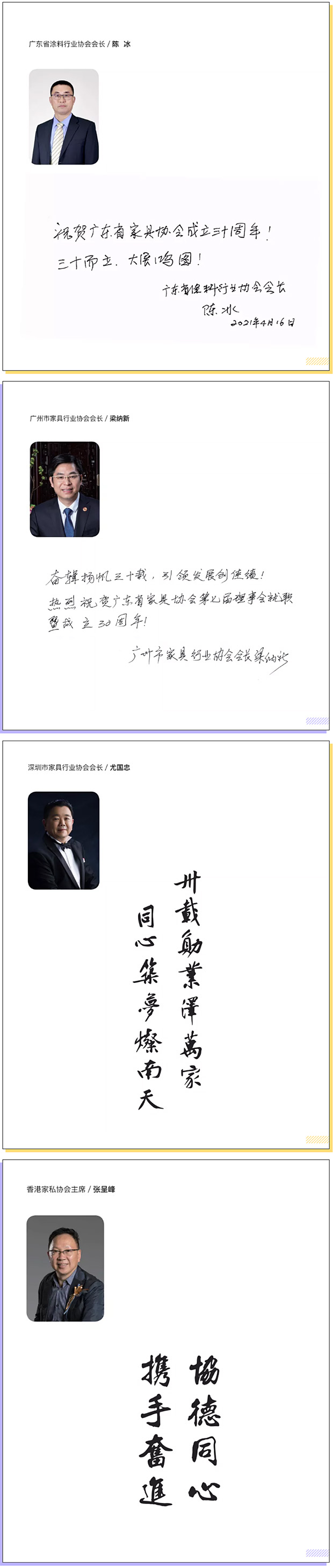 编者按:三十载初心不改,立潮头再创辉煌。广东家协三十年的风雨历程,充分证明行业协会的发展,与国家政策和行业兴衰息息相关,与理事会和秘书处的团结奋进息息相关,与合作单位和友好协会的精诚合作息息相关。我们将继续践行“为行业、会员、政府服务”的宗旨,坦然面对前进中的困难和障碍,做到初心不改、勇立潮头,科学谋划、高歌前行,积极引导行业企业走高质量发展之路,为推动我国向家具强国迈进作出新的更大的贡献! 2021年,在广东省家具协会成立三十周之际,广东省涂料行业协会会长陈冰、广州市家具行业协会会长梁纳新、深圳市家具行业协会会长尤国忠、香港家私协会主席张呈峰纷纷发来贺词表示祝贺。