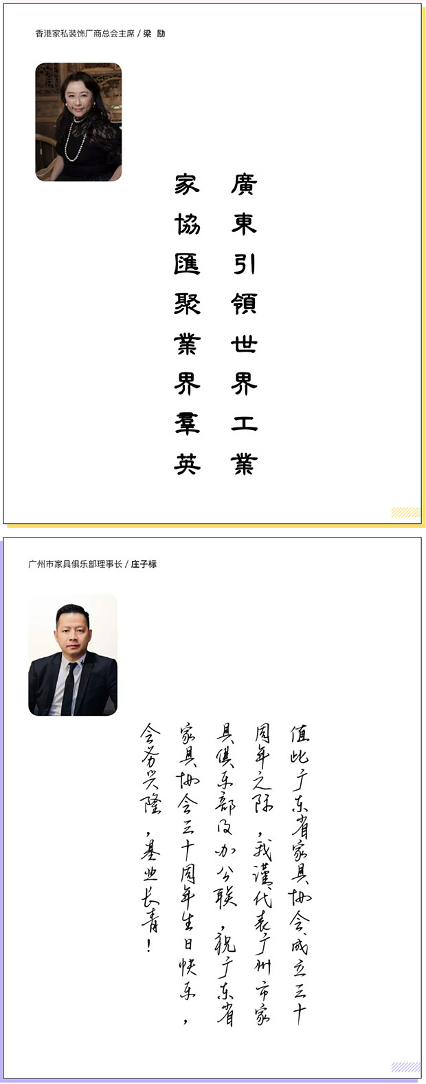 编者按:三十载初心不改,立潮头再创辉煌。广东家协三十年的风雨历程,充分证明行业协会的发展,与国家政策和行业兴衰息息相关,与理事会和秘书处的团结奋进息息相关,与合作单位和友好协会的精诚合作息息相关。我们将继续践行“为行业、会员、政府服务”的宗旨,坦然面对前进中的困难和障碍,做到初心不改、勇立潮头,科学谋划、高歌前行,积极引导行业企业走高质量发展之路,为推动我国向家具强国迈进作出新的更大的贡献! 2021年,在广东省家具协会成立三十周之际,香港家私装饰厂商总会主席梁励、广州市家具俱乐部理事长庄子标发来贺词表示祝贺。