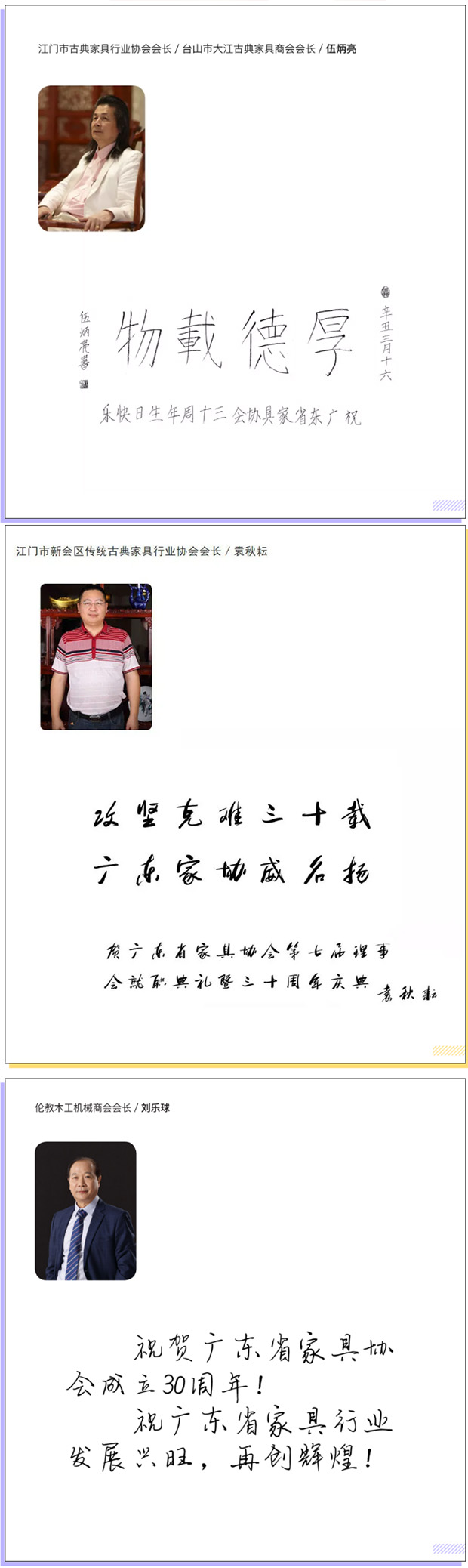 编者按:三十载初心不改,立潮头再创辉煌。广东家协三十年的风雨历程,充分证明行业协会的发展,与国家政策和行业兴衰息息相关,与理事会和秘书处的团结奋进息息相关,与合作单位和友好协会的精诚合作息息相关。我们将继续践行“为行业、会员、政府服务”的宗旨,坦然面对前进中的困难和障碍,做到初心不改、勇立潮头,科学谋划、高歌前行,积极引导行业企业走高质量发展之路,为推动我国向家具强国迈进作出新的更大的贡献! 2021年,在广东省家具协会成立三十周之际,江门市古典家具行业协会会长/台山市大江古典家具商会会长伍炳亮、江门市新会区传统古典家具行业协会会长袁秋耘、伦教木工机械商会会长刘乐球纷纷发来贺词表示祝贺。