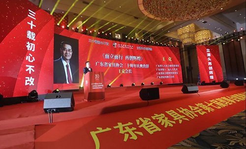 而立而行 再创辉煌 各位嘉宾、家具同仁们: 三十情缘沧海笑,岁月流金涛声起。 在社会各界的热情关心和鼎力支持下,广东省家具协会走过了三十个春秋,今晚我们隆重举行30周年庆典活动,与大家一起共叙友情、畅想未来。 首先,我们衷心感谢省委省政府有关领导和省民政厅、省工信厅、省商务厅、省市场监管局、省林业局等相关部门、中国家具协会、广轻控股集团、省社会组织总会等单位长期以来的热情指导,感谢刘介元、颜家焕、曾伯坚、王冶等历任领导,感谢历届理事会、监事会成员和全体会员的一路同行。我们特别感谢莅临现场的各位领导、友好协会、理事会监事会成员、会员代表、新老朋友,感谢顺联家居汇等单位对本次活动的鼎力支持。 1990年,由省室内装饰陈设配套工业公司发起,经省二轻工业厅同意,报省民政厅批准,广东家协在南海县召开“第一届会员代表大会”,当时50多间家具骨干企业参加,选举产生第一届理事会,刘介元同志任创会理事长。 1990-2020年,我们经历了国家改革开放最重要的发展时期,也经历了亚洲金融危机、全球金融危机、全球疫情大爆发。30年来,广东家具行业突飞猛进,从1990年产值仅9.6亿元、出口1.3亿元,到2020年销售额4500亿元、出口1187亿元,年递增率达到23%、26%。正是广大家具人的不懈努力,令广东成为中国家具行业重要的生产、出口、市场基地,并一直处于龙头地位,赢得“中国家具看广东”美誉。 为此,广东家协可谓是功不可没,因为我们是参与者、更是推动者!30年来,协会秉承“携手合作,共创辉煌”的办会精神,抓住计划经济向市场经济转变的契机,抓住会展经济推动市场多元化发展的契机,抓住政府职能向社会转移的契机,抓住行业三次转型升级的契机,坚持以科学发展观为指导,认真贯彻落实中央和省委、省政府的工作部署,先后带领行业克服了内销价格战、美国反倾销、两高一资、达芬奇事件等行业重大危机,在贯彻精神、规划指导、组织建设、参政议政、品牌建设、转型升级、展览交流、设计创新、人才培养、社会公益等十个方面做了大量工作。协会的服务能力和经济实力从小到大、从弱到强,多次得到省委省政府有关领导和上级部门的肯定和表彰,为我省家具行业的繁荣、稳步发展作出了重要贡献! 三十载初心不改,立潮头再创辉煌。广东家协三十年的风雨历程,充分证明行业协会的发展,与国家政策和行业兴衰息息相关,与理事会和秘书处的团结奋进息息相关,与合作单位和友好协会的精诚合作息息相关。让我们继续践行“为行业、会员、政府服务”的宗旨,坦然面对前进中的困难和障碍,做到初心不改、勇立潮头,科学谋划、高歌前行,积极引导行业企业走高质量发展之路,为推动我国向家具强国迈进作出新的更大的贡献!