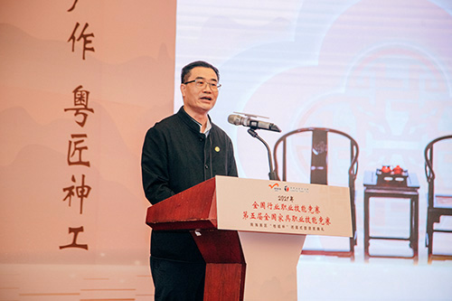 今年,南海赛区的各项组织工作做到全面、细致、有序、圆满,值得称道。赛前,广泛宣传发动会员企业踊跃报名参赛,落实比赛场地和物料准备,技能竞赛图稿设计,组织选手做好理论复习,召开竞赛经验交流分享会,安排全员集中核酸检测。赛中,全程严格按照疫情防控要求做好赛场相关工作,全方位及时的宣传报道,全体选手在竞赛中秩序良好、努力拼搏,当中不乏有夫妻、母子、师徒、男女同台竞技,大家赛出了风格、赛出了水平、赛出了友谊,选手的年轻化也印证了“江山代有才人出”。值得一提的是,本届竞赛的工作台、开幕式鸣锣用的架子都是红木制作,这在七个赛区中是最好的设施,足以证明桂城对赛事的高度重视。 改革开放以来,广东一直是中国家具行业的制造大省、贸易大省、出口大省,更是广作家具的发源地和传承地。作为广东著名传统文化品牌之一,广作家具代表了中国传统家具文化最高水准的艺术流派之一。在长期发展过程中,广作家具既保留了中国传统家具的审美艺术和精湛技艺,也在家具造型和装饰纹上形成鲜明独特的风格,彰显了岭南人开放创新、兼容并蓄的文化底蕴,让广作家具“润物无声”地融入人们的日常生活中。因此,作为中国传统家具文化的一个载体,我们一定要坚持把广作家具不断地传承、发扬、光大! 在此,我提两点希望:一是希望主办单位和南海红木协会及时做好宣传报道,认真总结竞赛经验,深挖文化内涵,凸显雕刻技艺魅力,提升行业凝聚力和影响力,为今后提高技能竞赛质量水平和创新竞赛形式提供成功案例。二是希望借此竞赛活动,大力弘扬劳模精神、劳动精神和工匠精神,鼓励更多的年轻人投身红木家具文化产业,争当“广东技工”的生力军和主力军,为促进我国传统文化的有序传承,为推动红木家具行业健康发展做出更大贡献! 最后,祝愿各位身体健康,万事胜意! 谢谢大家!
