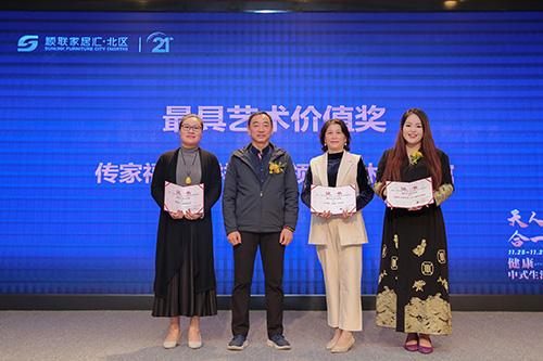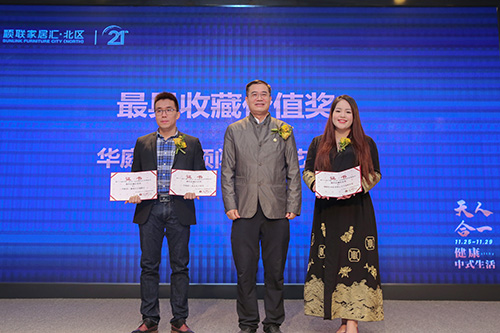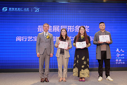 博览会上,为表彰企业在红木家具产品制作上的传承和创新,举行了红木家具颁奖仪式,广东省家具协会会长王克、执行会长兼秘书长张承志、执行会长李礼,顺联家具城·北区总经理胡柯为获奖企业代表颁奖。 经评委公平、公正、严谨的评选,共评出最具收藏价值奖、最具艺术价值奖、最佳制作工艺奖、最佳展厅形象奖等奖项。其中,华庭居•家大业大沙发、华庭居•镶理石百福圆台、领阅红木艺术馆•百子运财沙发摘得“最具收藏价值奖”,传家福•高贵一生沙发、雅祥居•大财源沙发、领阅红木艺术馆•百宝镶书房系列则分别斩获“最具艺术价值奖”。这些获奖作品展现了新时代的东方家居空间设计理念和新时代的工匠精神,充分彰显了红木家具的文化与艺术魅力。