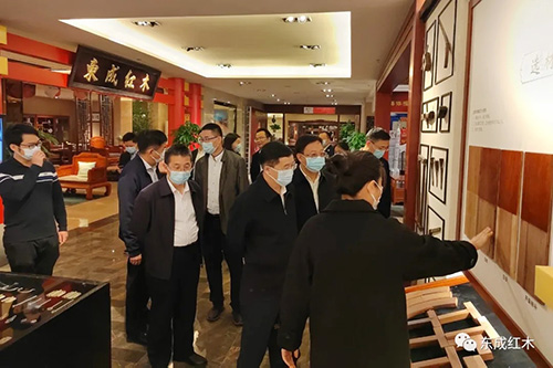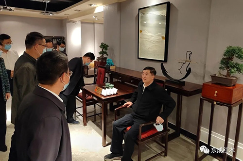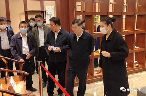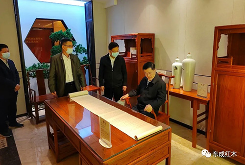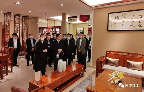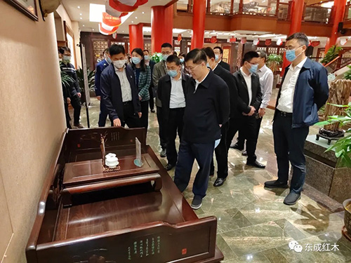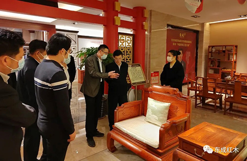 通过与红木家具的近距离接触, 调研组一行深刻感受到东成红木家具精品的独特魅力以及东成红木执着追求的精益求精的工匠精神。领导们对东成红木家具精湛的工艺和紧跟当代审美及实用性需求的设计理念给予了高度肯定。同时鼓励东成红木要坚定发展信心,不断创新思路,在开展产品绿色制造、用文化引领产业发展等方面积极作为,继续发挥好红木家具龙头企业的引领和示范作用,为广东省经济繁荣发展持续贡献东成力量。