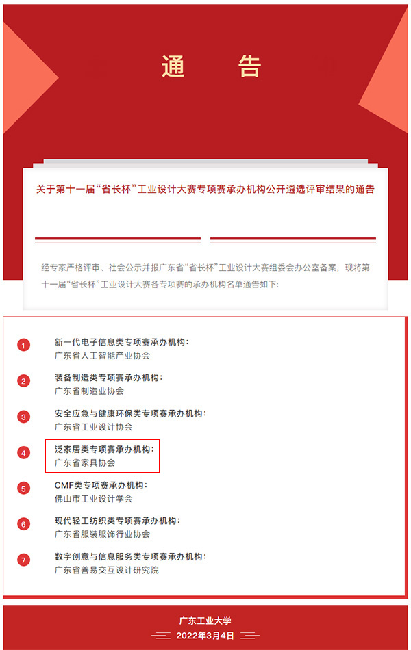 喜报:广东家协中标第十一届“省长杯”工业设计大赛泛家居专项赛承办机构
