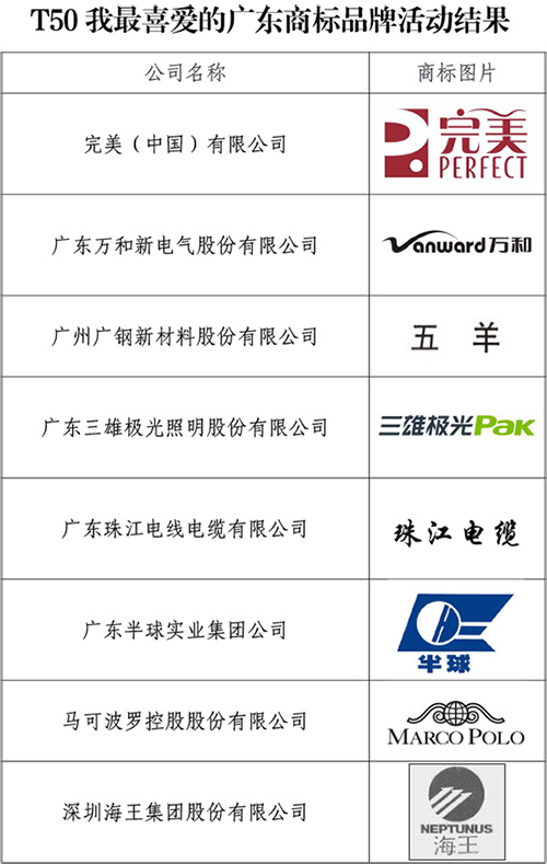 关于“T50我最喜爱的广东商标品牌”公益调查活动结果的公告 为营造保护知识产权的良好环境,扩大广东商标品牌的国际影响力,提高广东商标产品的市场竞争力,打造广东商标品牌集群高地,广东商标协会联合50个相关省级行业协会、各市(区)商标协会等单位,组织开展我最喜爱的广东商标品牌TOP50公益调查活动。活动自启动以来,通过企业自荐、相关单位推荐等方式,在广东省范围内广泛征集样本,样本涵盖了多领域、多行业。经组委会严格筛选,精选出102个(含并列名额)商标样本,并投放至市场,接受全国各地社会大众的自主投票,投票期间,得到了社会广泛关注,累计2420多万访问量;累计980多万社会投票,日均增长率达29.1%,其中广东省21地市约占63%,全国其他地区约占36%。最终产生TOP50件涵盖了食品、药品、陶瓷、汽车、农业等行业的广东商标品牌,其中包含32个2020年度广东省重点商标保护名录纳入商标。 金杯银杯不如消费者的口碑,本次活动表明,广东省已经形成了一批社会知名度高、社会影响力大,并且深受广大消费者喜爱的商标品牌,大大促进了广东自主商标品牌的发展,推动了消费市场对广东商标品牌的广泛认知。 组委会联系方式:黄泽锜/张晨020-85587049/020-85586207 附表:《T50我最喜爱的广东商标品牌活动结果》