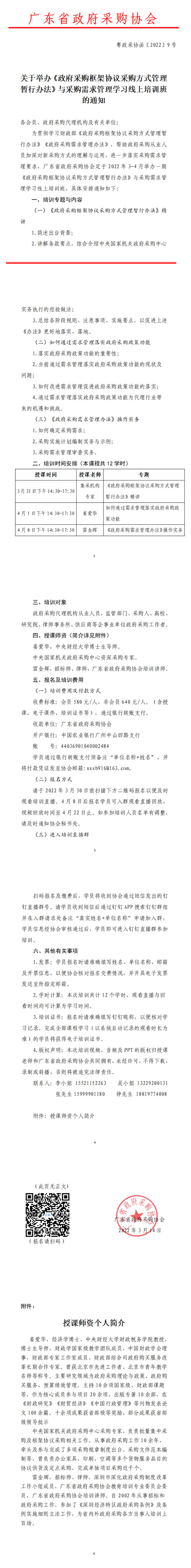 为帮助政府采购从业人员加深对新采购方式的理解与运用,进一步落实采购需求管理要求,现转发广东省政府采购协会《关于举办<政府采购框架协议采购方式管理暂行办法>与采购需求管理学习线上培训班的通知》,具体通知文件详见附件。