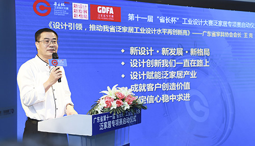 新设计·新发展·新格局。 为进一步发挥全省泛家居企业、设计机构及设计院校在工业设计创新体系中的主体作用,发挥工业设计的支撑引领作用,打造“广东设计”品牌,推动我省泛家居行业工业设计发展。今天,非常高兴相聚在著名的中国家具展览贸易之都——厚街镇,再次举办省长杯泛家居专项赛的启动仪式,为此,对各位表示热烈欢迎!感谢大家长期以来对我省泛家居工业设计的关心与支持。 5月初,由广东省工业和信息化厅主办、广东工业大学承办的第十一届“省长杯”工业设计大赛正式启动。本届大赛以“新设计·新发展·新格局”为主题,聚焦广东战略性产业集群建设,着力提升工业设计创新能力,进一步推动大赛国际化、市场化发展,积极打造“广东设计”品牌,支撑服务我省制造业高质量发展。大赛分初赛、复赛、决赛三个阶段举行。初赛按10%入围复赛(即泛家居等八个专项赛),复赛按20%入围决赛,角逐各项大奖。今年决赛最高单项的奖励标准达100万元,究竟花落谁家,值得期待。 设计创新我们一直在路上。自1990年成立以来,省家具协会一直践行“为行业、会员、政府服务”的办会宗旨,坚持“创新驱动、技术改造、环境治理、优化升级”的行业指导思想,积极倡导推动新中式家具发展,加大行业技术创新投入,提高行业设计创新能力,引导企业走创新型、效益型、集约型、生态型发展之路,先后有超过七万名来自生产企业、设计机构、设计师、设计院校师生参加了我会组织的历届省长杯专项赛、华笔奖系列设计大赛、设计展、设计论坛等活动,为我省家具行业源源不断地输送大量设计人才,提高行业工业设计水平,促进行业高质量发展作出积极贡献!