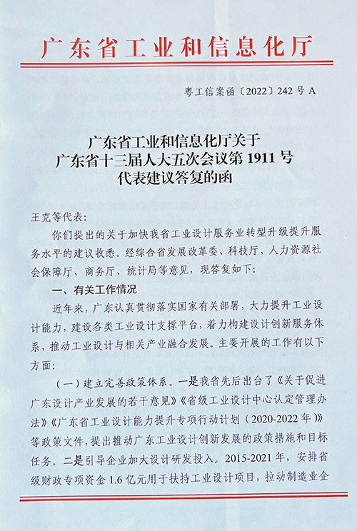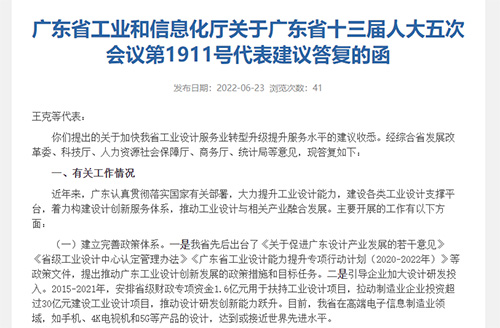 《答复函》强调,今后主要工作:一是加强设计载体建设,引导企业加大对工业设计的重视和投入力度,提升基础研究和公共服务能力,形成高效的市场盈利模式,争创国家工业设计研究院。二是加大高水平工业设计相关创新平台的认定力度,聚集省内外优势创新资源,依托国家、省级工业设计中心、研究院等载体,加强工业设计理论和共性技术研究,积极推进工业设计基础研究。三是提升设计服务能力,支持工业设计服务开展国际合作交流,强化知识产权保护和知识成果转化,打造工业设计服务业转型升级创新支撑平台,创新先进制造业和现代服务业融合发展模式。四是完善公共服务平台建设,办好第十一届“省长杯”工业设计大赛及广东设计周活动,进一步提升大赛国际化和市场化水平,擦亮“广东设计”品牌,为我省战略性产业集群发展提供更有力支撑。五是培育更多工业设计人才。组织实施好工业设计工程技术人才职称评审,加强设计人才技工教育,为全省体验设计创新发展提供高质量人才供给。六是做好监测统计服务。加强工业设计有关监测分析工作,加强对工业设计服务业企业经济运行情况的预警和发展趋势的分析,促进工业设计服务业持续健康发展。 今年初,在省第十三届人大五次会议上,省人大社会建设委委员、省社会组织党委委员、省家具协会会长王克围绕我省社会、经济、民生积极建言献策,提交了七份书面《建议》,受到省政府相关部门的肯定。其中,《加快我省工业设计服务业转型升级,提升服务水平的建议》指出,针对我省工业设计服务业为广大中小企业服务中遇到的瓶颈问题:存在自身服务能力拓展方面尚有较大的提升空间,作为“形式供应商”无法根本解决企业的创新问题,缺乏高端服务能力,向产品公司转型并非最佳出路,人才梯队的不合理配置等问题。结合工业设计服务业的特点及价值,加快我省工业设计服务业转型升级,提升服务水平十分必要。 王克代表在《建议》中提出五点具体建议: