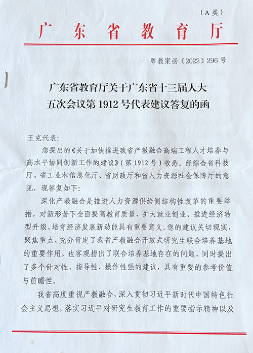 《答复函》表示,深化产教融合是推进人力资源供给侧结构性改革的重要举措,对新形势下全面提高教育质量、扩大就业创业、推进经济转型升级、培育经济发展新动能具有重要意义。您的建议关切现实,聚焦重点,充分肯定了我省产教融合开放式研究生联合培养基地的重要作用,也客观指出了联合培养基地存在的问题,同时提出了多个针对性、指导性、操作性强的建议,具有重要的参考价值与前瞻性。 《答复函》指出,我省高度重视产教融合,创新研究生培养模式,促进教育链、人才链与创新链、产业链的有效衔接,构建多元协同的高水平科技自主创新体系。主要工作如下:一是重视组织领导和协调联动。二是合力创新人才培养模式,2020年全省安排专项联合培养计划共80名,2021年120名,2022年150名,并鼓励高校在落实专项计划基础上,自行安排更多联合培养计划。三是支持产学研科技合作项目,以龙头企业实际需求为导向凝练攻关课题,鼓励企业牵头联合高校等科研产业发展的“卡脖子”问题。四是构建稳定保障机制。省财政建立“生均拨款+专项资金”的稳定经费保障机制,支持高等教育内涵式发展。 《答复函》强调,下一步工作计划:(一)进一步强化顶层设计,多措并举促融合。培养适应和引领现代产业发展的应用型、复合型、创新型工程人才。建立多形式的合作关系,实现创新能力共享,构建产学研协同发展的创新生态。(二)进一步加强多方协同,探索育人新模式。加强与地市政府、企业、科研机构合作,共建联合研究院、技术研究院等新交叉的科研创新平台建设,整合各类科技资源,形成科研创新合力。(三)进一步凝炼培养特色,力争打造研究生联培基地样板。设立基地建设标准,会同协同科技、工信、人社、财政等部门,争取更大的协同效应和协同创新成效。探索成立产教融合研究生联合培养协作联盟,逐步在粤东西北等主要节点城市推广开放式基地。 今年,在省十三届人大五次会议上,省人大社会建设委委员、省社会组织党委委员、省家具协会会长王克围绕我省社会、经济、民生积极建言献策,提交了七份书面《建议》,受到省政府相关部门的肯定。其中,《关于加快我省产教融合高端工程人才培养与高水平协同创新的建议》指出,我省产教融合开放式研究生联合培养基地做法独特、成效显著,缓解了当前我省高端工程人才供给与产业创新发展需求矛盾,为制造强省、科技强省提供有力的人才与智力支撑,形成了六个经验:有利于培养高端工程人才,有利于构建高水平协同创新,有利于解决企业技术需求,有利于促进高校成果转化,有利于促进人才招聘与就业,有利于推动区域创新创业等做法行之有效,值得总结和推广。 王克代表在《建议》中提出八点具体建议: