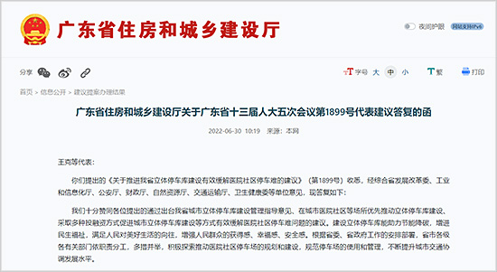 《答复函》表示,我们十分赞同各位提出的通过出台我省城市立体停车库建设管理指导意见、在城市医院社区等场所优先推动立体停车库建设、采取多种投融资方式促进城市立体停车库建设等方式有效缓解医院社区停车难问题的建议。建设立体停车库能助力节能降碳,增进民生福祉,满足人民对美好生活的向往,增强人民群众的获得感、幸福感、安全感。根据省委、省政府工作的安排部署,省市各级各有关部门依职责分工,多措并举,积极探索推动医院社区停车场的规划和建设,规范停车场的使用和管理,不断提升城市交通协调发展水平。 《答复函》指出,目前已开展工作:1、出台我省城市停车管理指导意见。2、建立省级城市停车设施发展联席会议机制,统筹推进全省城市停车设施规划建设管理工作。3、加大资金支持力度,推动停车设施项目的建设落地。4、加快停车设施提质增效。5、开展医院社区停车优化工作。6、强化规划引领。7、促进节约集约复合利用。8、加大土地供应力度。9、加大停车位供给。10、加快实现物业管理和车辆管理智能化。11、明确规定物业服务企业对充电桩的管理责任。12、鼓励社会资本参与。13、创新金融支持方式。