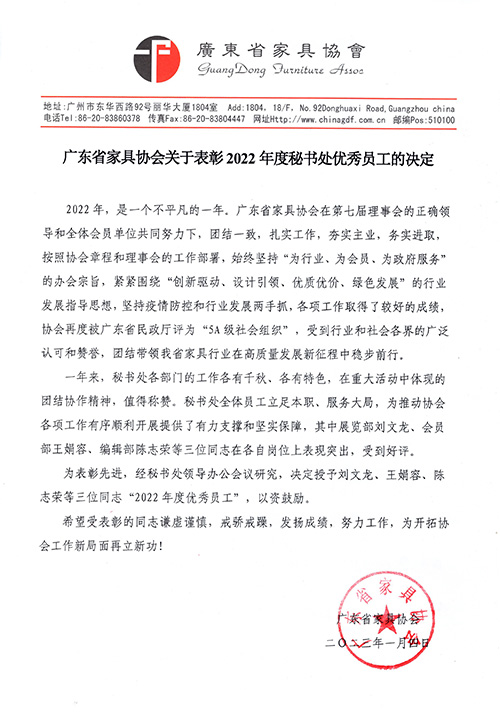 2022年,是一个不平凡的一年。广东省家具协会在第七届理事会的正确领导和全体会员单位共同努力下,团结一致,扎实工作,夯实主业,务实进取,按照协会章程和理事会的工作部署,始终坚持“为行业、为会员、为政府服务”的办会宗旨,紧紧围绕“创新驱动、设计引领、优质优价、绿色发展”的行业发展指导思想,坚持疫情防控和行业发展两手抓,各项工作取得了较好的成绩,协会再度被广东省民政厅评为“5A级社会组织”,受到行业和社会各界的广泛认可和赞誉,团结带领我省家具行业在高质量发展新征程中稳步前行。 一年来,秘书处各部门的工作各有千秋、各有特色,在重大活动中体现的团结协作精神,值得称赞。秘书处全体员工立足本职、服务大局,为推动协会各项工作有序顺利开展提供了有力支撑和坚实保障,其中展览部刘文龙、会员部王娟容、编辑部陈志荣等三位同志在各自岗位上表现突出,受到好评。 为表彰先进,经秘书处领导办公会议研究,决定授予刘文龙、王娟容、陈志荣等三位同志“2022年度优秀员工”,以资鼓励。 希望受表彰的同志谦虚谨慎,戒骄戒躁,发扬成绩,努力工作,为开拓协会工作新局面再立新功! 广东省家具协会