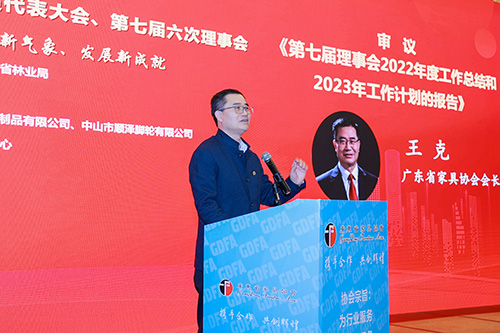 王克会长在报告中总结了协会2022年主要工作。一是协会建设,践行高质量发展新使命;二是市场开拓,踏出高质量发展新步伐;三是设计创新,注入高质量发展新动力;四是产业发展,迈上高质量发展新台阶;五是工作创新,提供高质量发展新支撑;六是人才建设,培育高质量发展新动能;七是人大工作,展现高质量发展新作为。 高质量发展是全面建设社会主义现代化国家的首要任务,也是广东实现现代化的必由之路、光明之路、奋进之路。新春伊始,广东擂起了高质量发展的行动战鼓,奏响了走在前列的奋进强音,“等不起”“慢不得”“坐不住”的紧迫感正化为广东自上而下的行动自觉。 在报告中,王克会长强调,社会组织作为社会主义现代化建设的重要力量,助推广东高质量发展使命在前、重任在肩!作为全省先进社会组织,我们要当好广东高质量发展的坚决贯彻者、坚实推动者、坚定践行者。为此,2023年广东家协主要开展几个方面的工作:协会建设方面,坚持党建引领、高质量发展共识、召开会员代表大会、组织交流学习活动;市场开拓方面,参与主办三个展览、参与“泛珠大会云展厅”宣传活动、参与“粤贸全国”活动、推动中俄林业合作;设计创新方面,办好第十三届广州家居设计展、办好华笔奖系列杯赛、承办第十一届省长杯泛家居专项赛成果展、支持广东省家居设计研发中心建设;产业发展方面,推进我省家具行业数字化转型、推进我省智能家居互联互通、鼓励部分家具企业向粤东西北地区有序转移;行业创新工作,推广分布式光伏项目建设、深入开展我省家具行业品牌建设工作;人才建设方面,促进设计院校毕业生来我省就业、第五届全国家具职业技能竞赛总决赛、职称申报。